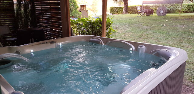 Cette suite propose un jacuzzi privatisé donnant sur le jardin sous abri avec une eau à 37 degrés, avec une désinfection permanente